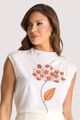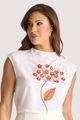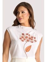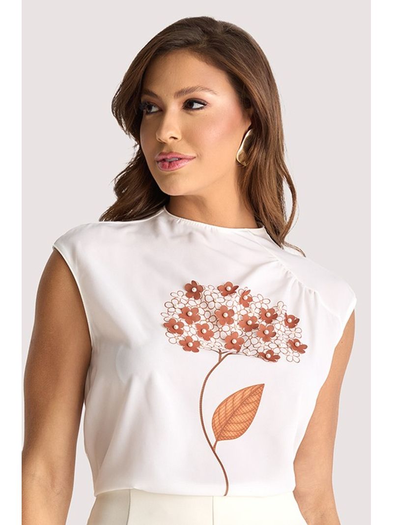 Blusa em crepe leve, com estampa exclusiva que traz delicadeza e sofisticação à peça. A modelagem reta proporciona um caimento fluido e confortável, enquanto as pregas e aplicações de flores e pérolas adicionam um toque de elegância e charme. O fechamento da gola nas costas com botão oferece um detalhe refinado.