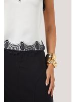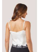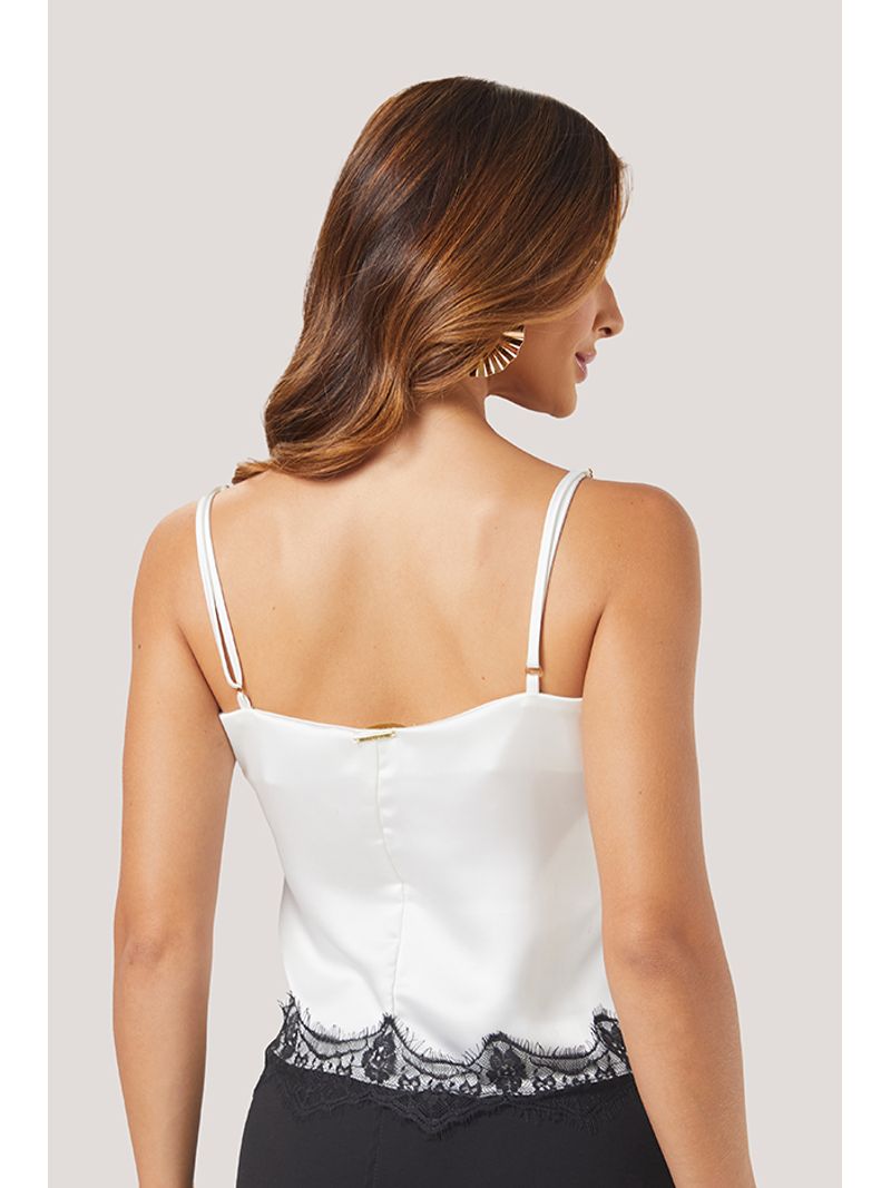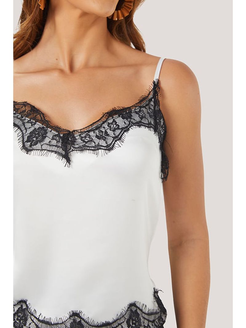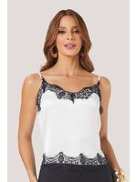 Esta blusa de alças finas apresenta um design delicado e preciso, com modelagem reta e recorte frontal levemente curvo, que valoriza o colo de forma sutil. O destaque técnico está na aplicação de renda delicada contrastante, posicionada estrategicamente no decote em V suave e na barra, criando um acabamento refinado e contínuo. As alças finas reforçam a leveza visual da peça, enquanto o corpo em tecido acetinado garante caimento fluido e toque macio, proporcionando conforto e sofisticação. Como diferencial estético, a combinação do fundo claro com a renda escura dialoga diretamente com a tendência de lingerie aparente, trazendo um ar contemporâneo e feminino, que transita entre o romântico e o urbano chic.