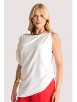Blusa assimétrica de viscose com modelagem fluida e caimento drapeado. A peça apresenta pregas detalhadas em um dos ombros e fivela metálica ombro oposto. Possui franzido nas laterais que valoriza o caimento, e fenda na lateral direita.