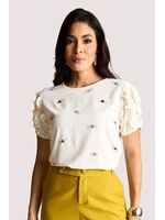 Blusa com aplicações e estampas em forma de bombons, une feminilidade e leveza com toque de humor refinado. A modelagem reta e o caimento fluido valorizam o corpo sem marcar, enquanto as mangas com babados acrescentam movimento e romantismo. O fechamento posterior com botão garante acabamento limpo e sofisticado.