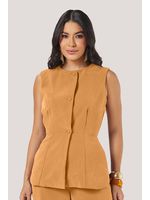 Blazer sem mangas, com modelagem de alfaiataria que une elegância e praticidade. Confeccionado em tecido plano encorpado, entrega estrutura ao corpo, valoriza os recortes e pences e garante um caimento firme, que mantém o visual alinhado do trabalho ao happy hour. O fechamento frontal com botões forrados e a barra levemente evasê criam um acabamento sofisticado, com toque moderno.