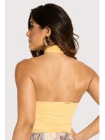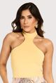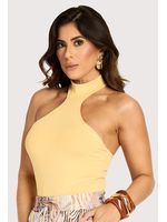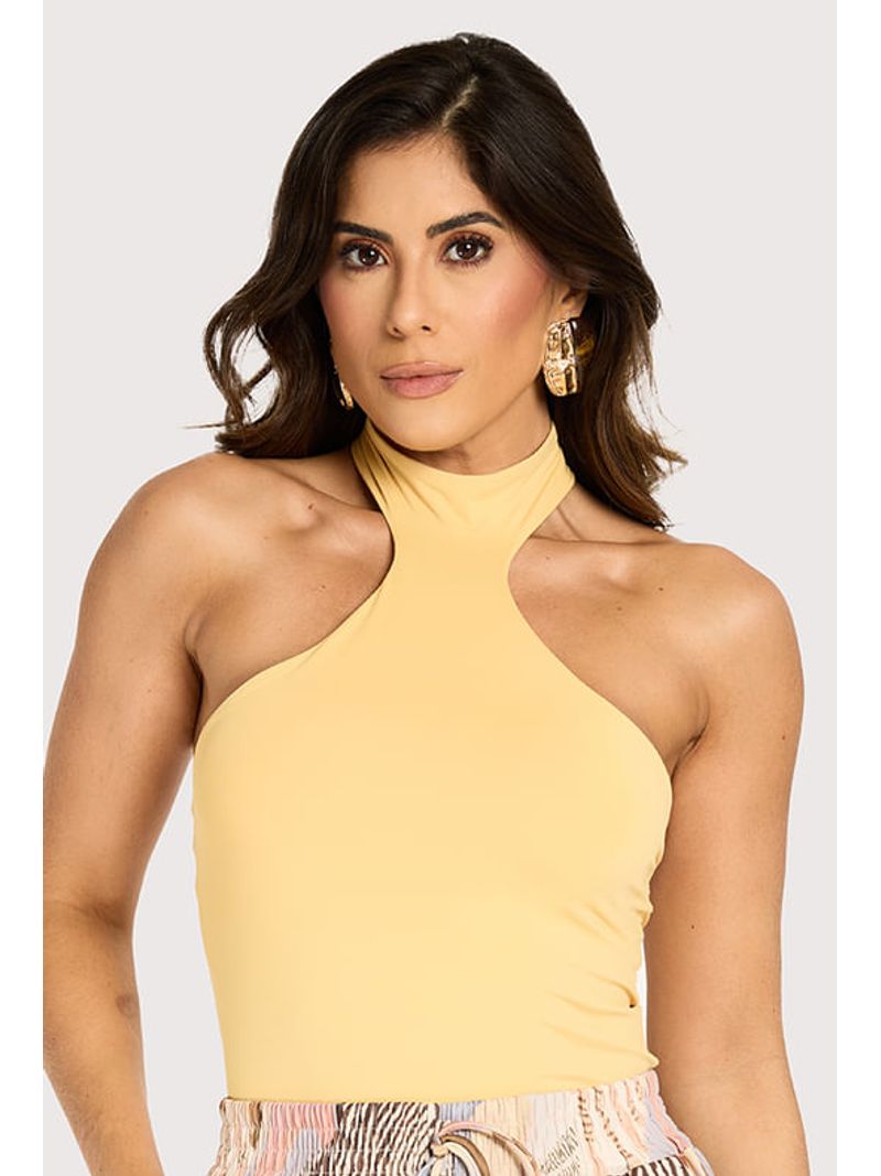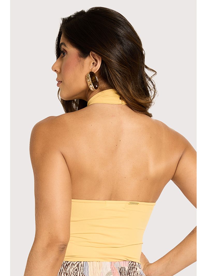Esta blusa em poliamida apresenta um design halter com leve torção frontal, criando um ponto focal sofisticado que valoriza o colo. A gola alta traz um ar moderno e elegante à peça, enquanto o fechamento costas por botão garante praticidade e um acabamento limpo nas costas.