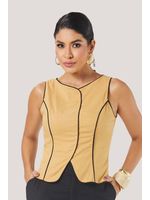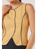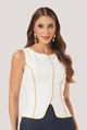 Tecido de toque macio e superfície lisa, com sensação limpa e confortável no contato com a pele. Modelagem sem mangas com caimento estruturado, marcada por recortes que acompanham o corpo e valorizam a silhueta. Vivos contrastantes contornam o desenho e destacam a frente transpassada com fenda, enquanto o zíper nas costas garante praticidade. Use com alfaiataria para o trabalho ou com jeans reto e sandália para um look casual chic, finalizando com blazer ou acessórios.