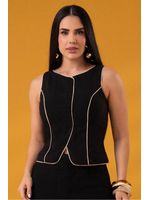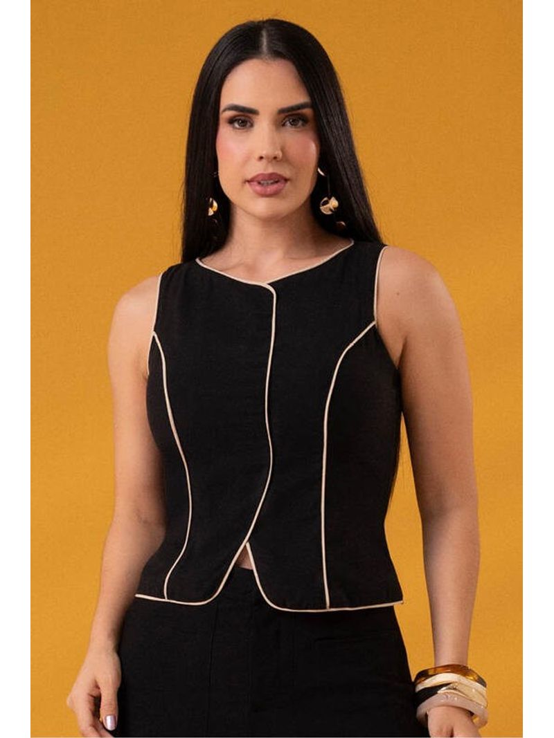 blusa alfaiataria plana estruturada com recortes frontais assimétricos e vivos contrastante, com zíper nas costa, que confere caimento firme e acentua a silhueta com elegância. Para um visual casual, combine com jeans destroyed e tênis branco, explorando o toque moderno do tecido sem abrir mão do conforto