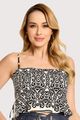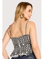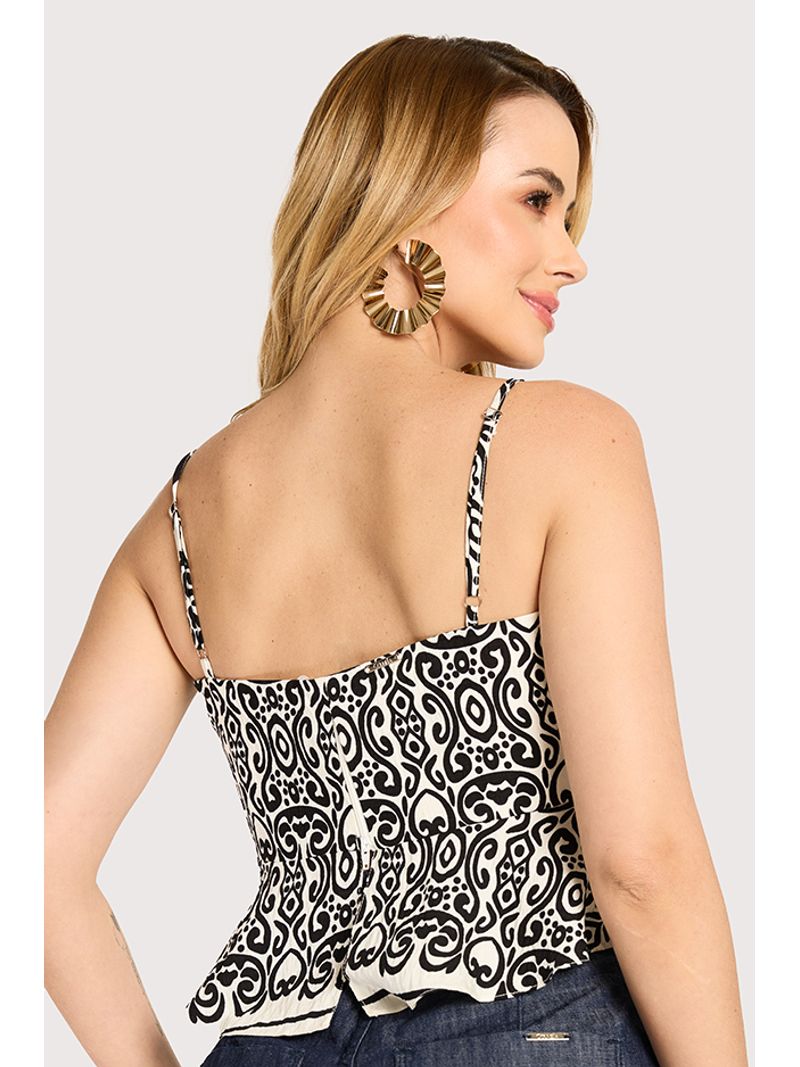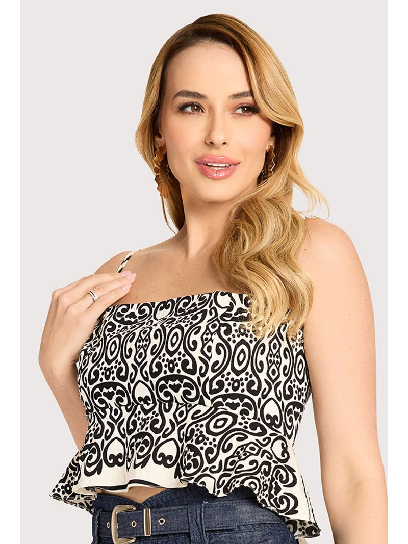 Blusa confeccionada em tecido plano de viscose. A peça tem modelagem ajustada ao busto, com alças finas ajustáveis que proporcionam melhor vestibilidade e conforto. O modelo conta com recorte logo abaixo do busto e detalhe de babado que cria movimento e suavidade no caimento. Possui estampa de arabescos e fechamento posterior por zíper, garantindo praticidade e acabamento refinado.