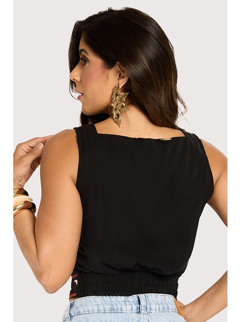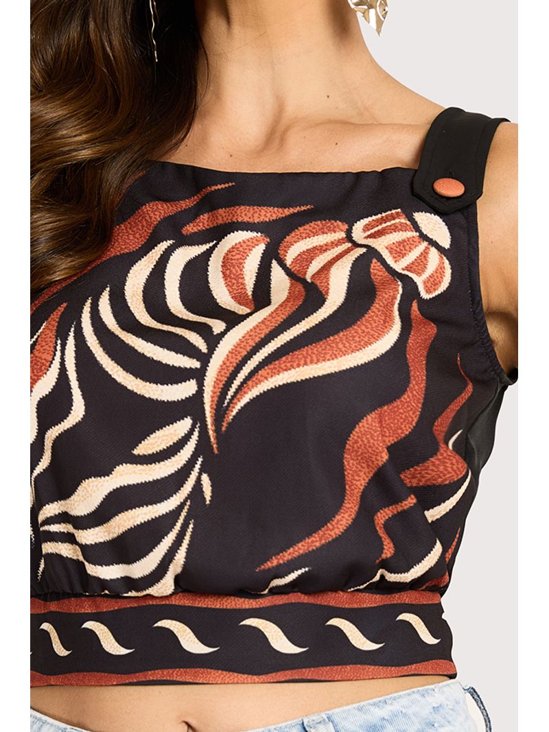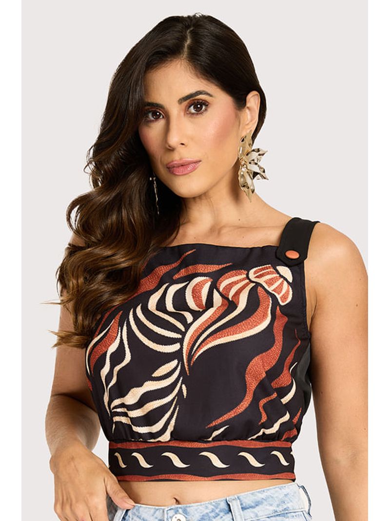 Blusa cropped em crepe leve e estampa exclusiva. Com decote quadrado e botão duplos coberto adiciona um toque de delicadeza, enquanto a pala frontal define o caimento e o elástico nas costas proporciona conforto e ajuste ideal.