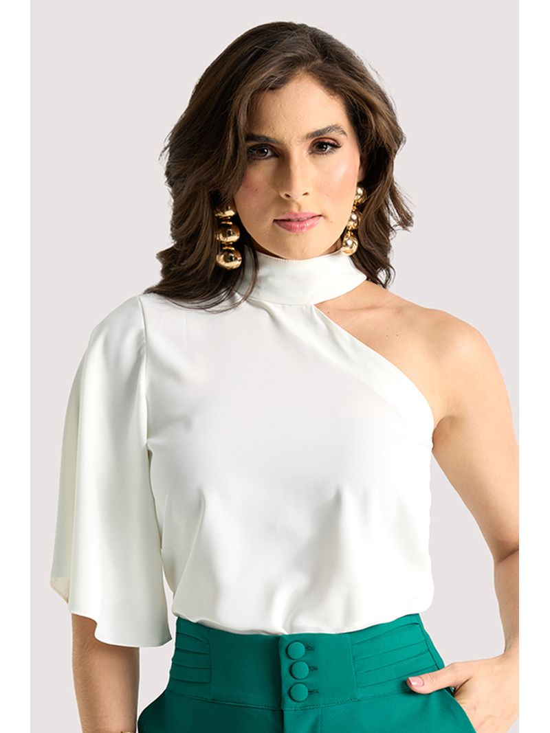 Blusa em tecido acetinado de toque leve e caimento fluido, valorizada por um design assimétrico contemporâneo. O recorte de um ombro só contrasta com a manga ampla de comprimento médio, criando um jogo de proporções sofisticado. A gola alta estruturada adiciona um toque de elegância e modernidade, reforçando o apelo fashion da peça. O acabamento limpo nas barras e a modelagem solta garantem conforto e movimento.