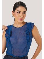 Com design delicado e fluido, esta blusa em tecido chiffon transparente traz o charme atemporal do poá em um visual leve e sofisticado. O modelo apresenta recortes frontais delineados por babados verticais, que criam um efeito de movimento e feminilidade, valorizando o contorno do corpo sem marcar. O decote redondo é finalizado com aplicação de vidrilhos que adicionam brilho sutil e elevam o acabamento da peça.