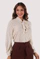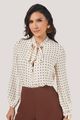 Camisa ampla confeccionada em chiffon com padronagem de poás, gola laço e abotoamento frontal.