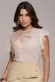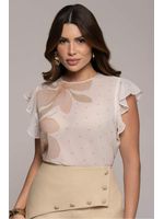 Blusa em musseline com poás e estampa floral suave, modelagem fluida e mangas jabour que acompanham o movimento com leveza. O decote costas com fenda e botão , destaca o cuidado nos acabamentos. O modelo é ideal para composições delicadas com bermudas e calças com modelagem estilo alfaiataria ou saias leves onde o romantismo é protagonista.