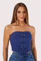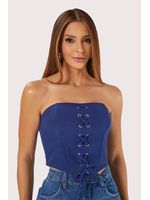 Este top tomara-que-caia em azul suave apresenta construção estruturada com recortes frontais que afinam visualmente o torso, criando um formato mais ajustado e definido. O destaque fica por conta do entrelace frontal: um trançado de cordões que atravessa ilhoses metálicos perfeitamente alinhados, funcionando tanto como elemento estético quanto como ajuste funcional. A barra frontal levemente alongada, finalizada com laço, reforça a inspiração corset¿core, tendência que revisita o corset tradicional com linguagem moderna e minimalista. O resultado é uma peça que combina sensualidade sutil e design contemporâneo, ideal para compor um mood de noite leve de verão ¿ onde tecidos frescos, brilho urbano e autoconfiança se encontram.