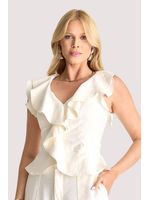 Blusa cropped em alfaiataria com recorte modelador que valoriza a silhueta e babados estratégicos que trazem movimento e romantismo. O fechamento posterior em zíper garante praticidade e acabamento elegante. Ideal para compor um visual sofisticado, pode ser combinada com calça de cintura alta e sandálias de salto para um look moderno e feminino.