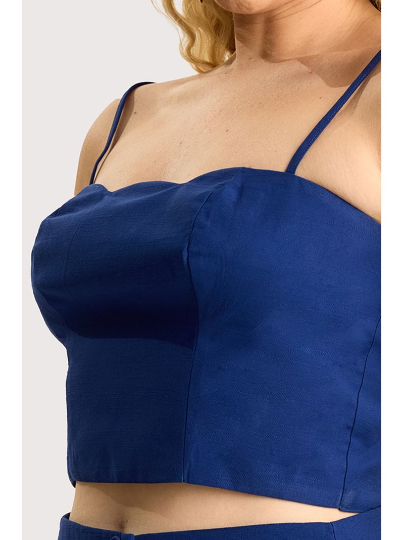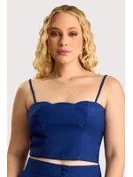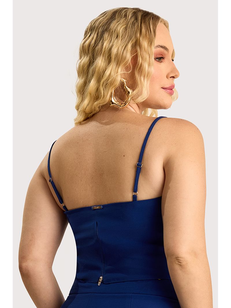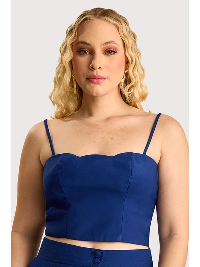 Blusa cropped em tecido de alfaiataria, com recorte que valoriza a silhueta. Possui decote com detalhe ondulado, alças finas reguláveis e fechamento nas costas por zíper. Peça totalmente forrada, garantindo melhor acabamento e conforto.