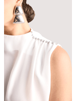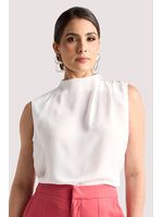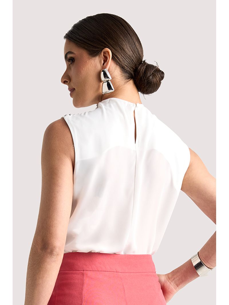 Blusa em crepe leve, com modelagem reta que garante caimento elegante. Possui gola alta e detalhe drapeado no ombro, enriquecido por aplicações de strass que adicionam um toque de sofisticação e delicado brilho à peça.