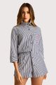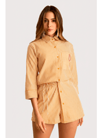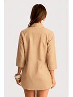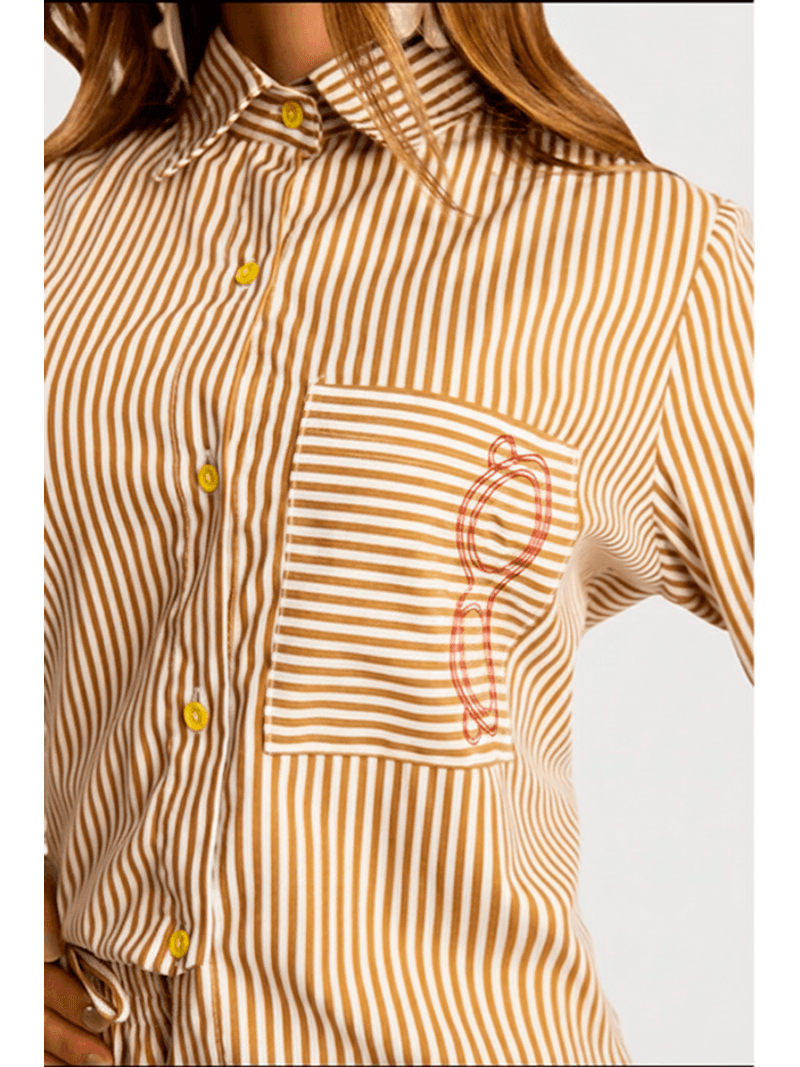 Camisa em tricoline listrada, com modelagem solta e caimento leve. Possui manga 3/4, gola clássica e abotoamento frontal. O bolso com bordado delicado adiciona um charme sutil à peça. Versátil, pode ser usada tanto em produções casuais quanto em composições mais elegantes.