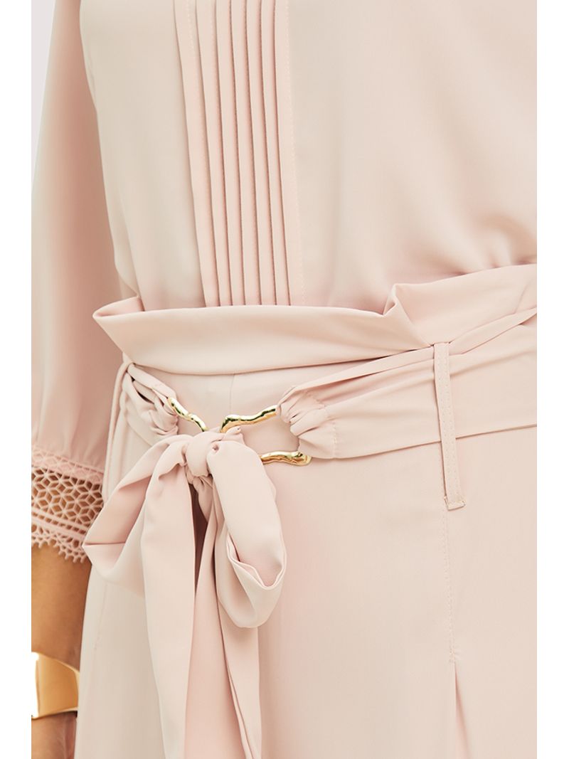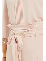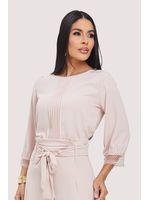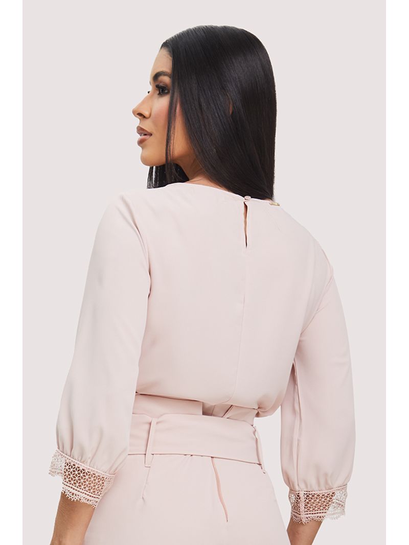 Blusa em crepe com mangas 3/4 traz delicadas pregas centrais que alongam a silhueta, além de detalhes em bicos aplicados nos ombros e punhos, adicionando sofisticação artesanal. O fechamento posterior em botão garante acabamento refinado e funcionalidade. Uma peça versátil e elegante, perfeita para compor looks de trabalho combinada a calça de alfaiataria e scarpin, ou para ocasiões especiais junto a saia midi fluida e sandália delicada.