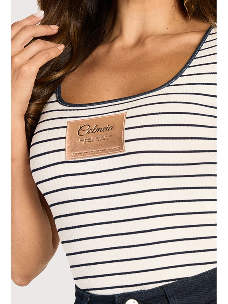 Essa blusa listrada é o tipo de peça que se adapta a diferentes estilos sem perder personalidade. Produzida em malha canelada, ela oferece o equilíbrio perfeito entre estrutura ¿ e caimento confortável. O decote quadrado com acabamento em vivo traz um toque de contraste que moderniza a peça e valoriza o colo. Outro ponto que reforça seu caráter exclusivo é a etiqueta frontal da marca autoral, aplicada como elemento de identidade e estilo. Além de comunicar autenticidade, ela funciona como detalhe estético, destacando o design cuidadoso.