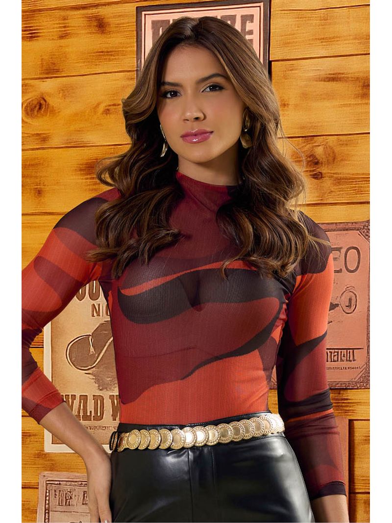 BLUSA EM TULE COM ESTAMPA EXCLUSIVA COLMEIA, MANGAS LONGAS, GOLA ALTA. FRENTE E COSTAS DUPLA.