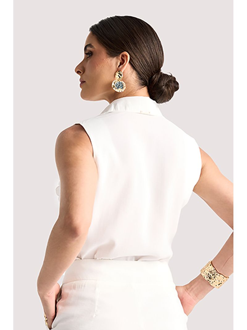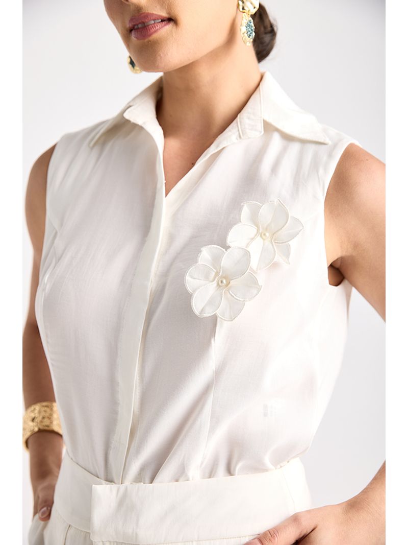 Blusa em sarja sem mangas, com abotoamento frontal coberto que garante um acabamento clean e aplicações de flores em relevo que trazem delicadeza e sofisticação. Sua modelagem estruturada proporciona um caimento elegante, perfeito para compor um visual urbano refinado.