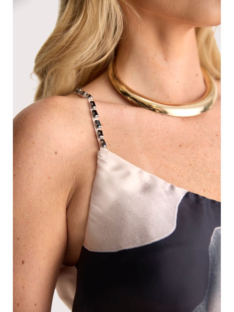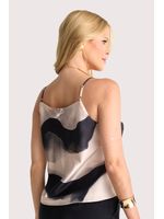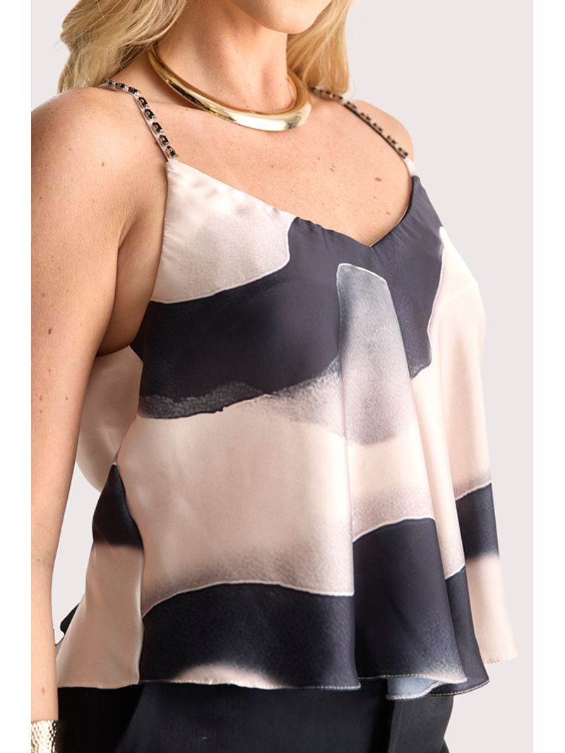 Blusa em cetim de seda com acabamento acetinado, esta peça apresenta recorte em decote ¿V¿ que valoriza o colo com sofisticação. As alças finas ganham destaque com aplicações de pequenas pedrarias, trazendo um toque de brilho delicado que adiciona elegância ao design minimalista. O caimento fluido é acentuado por pregas frontais discretas, que criam movimento sutil e um visual levemente evasê. A estampa aquarelada em tons de nude, preto e cinza dialoga com a tendência de abstracionismo orgânico, reforçando a estética artística que tem dominado passarelas e street style. Um diferencial contemporâneo que transforma a peça em item statement sem perder a versatilidade. Ideal para composições que transitam do casual chic ao urbano sofisticado, esta blusa convida a momentos de contemplação ao pôr do sol em rooftops urbanos ou encontros descontraídos com arte e música ao fundo.
