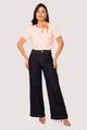 O jeans em tom profundo revela textura encorpada com toque macio, enriquecido pelo elastano que oferece liberdade de movimento. Sua modelagem wide leg garante caimento moderno e elegante, com bolsos tradicionais que reforçam a praticidade. O cós e as laterais ganham destaque com pespontos contrastantes, adicionando um charme extra. Versátil, combina tanto com camisas leves para um visual sofisticado quanto com t-shirts para um look casual.