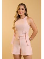 Conjunto em alfaiataria Marant com linho e efeito melange, trazendo sofisticação e textura natural. Modelagem cropped ajustada, com decote alto, pregas laterais e faixas com fivelas metálicas para ajuste perfeito. Fechamento posterior com zíper e botão. Short intermediário com faixa no cós. Ideal para looks contemporâneos, elegantes e versáteis.