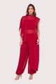O conjunto é composto por blusa e calça, com sobreposição de transparências que conferem leveza e movimento sofisticado. A blusa apresenta modelagem ampla e assimétrica, com um dos ombros cobertos por uma manga em formato de capa fluida, contrastando com o outro lado de cava limpa. A gola alta estruturada traz um toque contemporâneo e valoriza o caimento do tecido, que flui naturalmente sobre o corpo.O conjunto propõe um jogo elegante entre opacidade e transparência, destacando o design sem recorrer a excessos.
