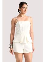 Conjunto em tecido estruturado garante caimento elegante, blusa realçada pelo busto com recortes marcados e a cintura levemente peplum, que equilibra a silhueta. O short apresenta barra, zíper posterior e aplicações de brilho nas laterais, enquanto as alças são finas e com brilho, adicionando um toque glam.