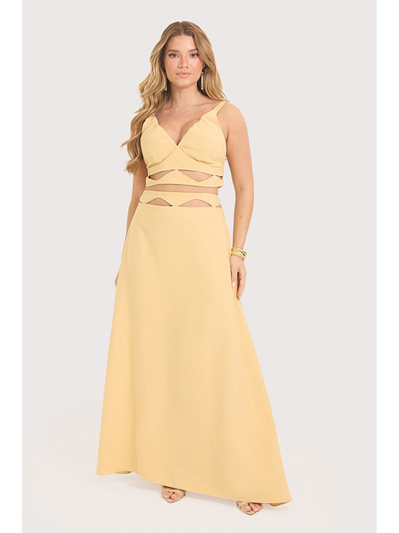A peça transmite leveza ao toque, com superfície suave e caimento fluido que acompanha o movimento com naturalidade. O top traz recortes estratégicos e acabamento franzido nas costas, enquanto a saia alonga a silhueta com modelagem limpa e zíper posterior. O conjunto equilibra sensualidade e delicadeza em um visual contemporâneo. Use em produções de verão com sandálias de tiras ou componha com sobreposições leves para um look sofisticado.
