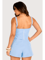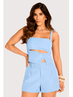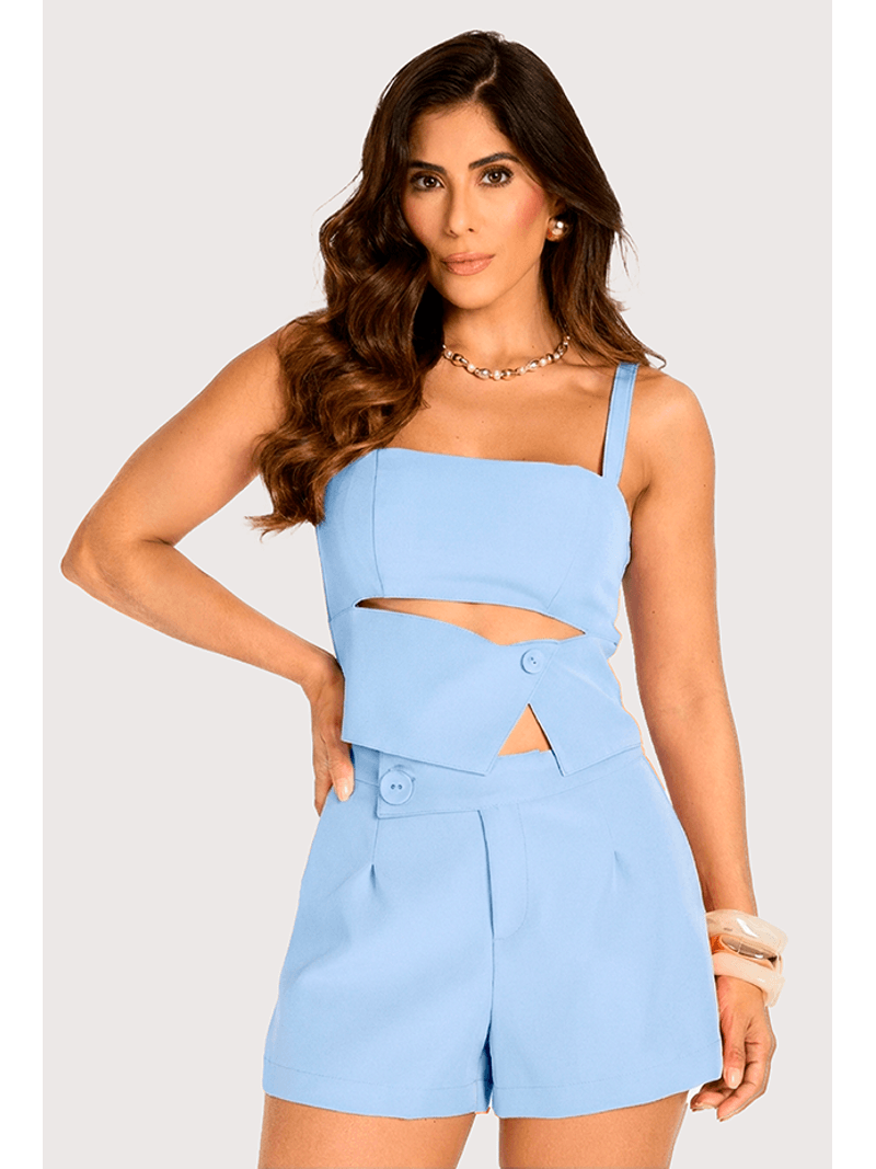 O tecido apresenta toque leve e levemente encorpado, com superfície fosca e estrutura que valoriza o corte. O top com recorte geométrico e detalhe de botão traz um ar moderno e sofisticado, enquanto o short de alfaiataria equilibra conforto e elegância. Ideal para dias ensolarados ou produções casuais refinadas, combina bem com sandálias, rasteiras ou blazer neutro.