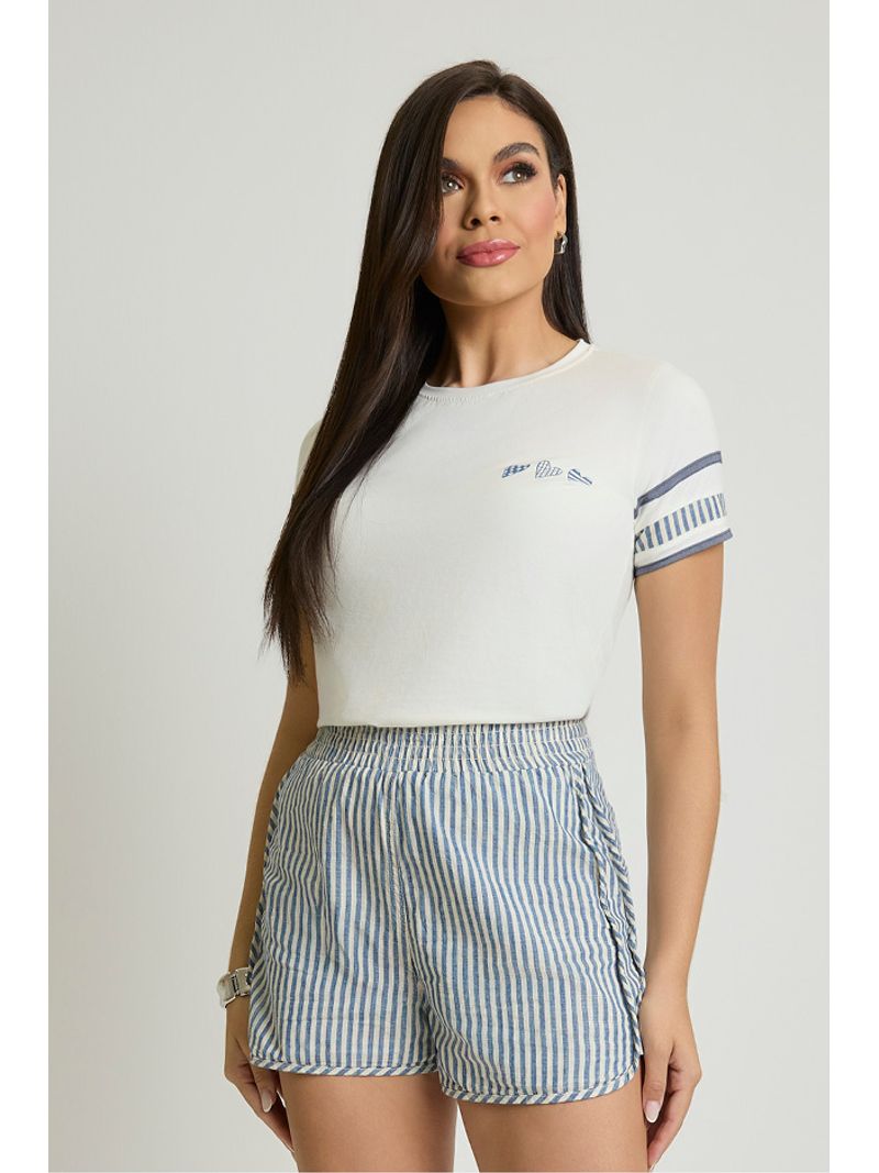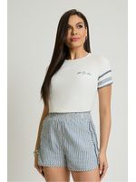 Conjunto composto por t-shirt em malha 100% algodão e short em tecido listrado plano, também em 100% algodão. A blusa traz recorte nas mangas com aplicação do mesmo tecido listrado do short e acabamento com viés, criando unidade visual. O silk frontal com corações em diferentes padronagens imprime delicadeza, ideal para tardes leves e cheias de encanto.