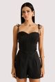 Macaquinho em alfaiataria barbie com busto estruturado, aplicação de viéses, alças finas para amarração e costas com detalhe em elástico que garante ajuste confortável. O short possui bolsos faca, pregas frontais e fechamento posterior por zíper, equilibrando praticidade e sofisticação. Ideal para um visual urbano elegante, pode ser combinado com sandálias de salto médio e acessórios minimalistas.