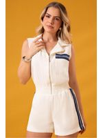 MACAQUINHO EM TECIDO ALFAIATARIA DE PESO MEDIO, COM ZIPER FRONTAL E GOLA, BOLSO E LATERAL DO SHORT COM GORGURÃO LISTRADO APLICADO.