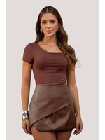 Saia confeccionada em material sintético de efeito couro, com superfície lisa e acabamento fosco, que garante visual contemporâneo e estrutura firme ao vestir. A modelagem curta apresenta cintura alta, proporcionando melhor ajuste ao corpo e valorizando a silhueta com conforto e segurança. O design se destaca pelo recorte assimétrico frontal, aplicado em sobreposição diagonal, que cria profundidade visual e movimento à peça. Esse detalhe técnico substitui o uso de pregas tradicionais, trazendo um efeito arquitetônico limpo e moderno. As costuras são discretas e precisas, reforçando o caráter minimalista e o cuidado na construção da peça.