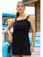 VESTIDO CURTO SOLTO EM TECIDO PLANO COM TEXTURA SOBREPOSIÇÃO FRENTE E BABADOS EM CASCATA COSTAS VIVO EM STRASS NO TOM NO DECOTE E ALÇAS ZÍPER COSTAS FORRADO