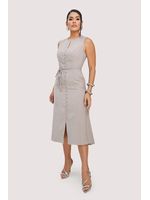 vestido em tecido plano de comprimento midi com abotoamento falso coberto do mesmo tecido e cinto fino de faixa. uma peça elegante, versátil e atemporal que pode ser usado em diversas ocasiões
