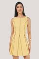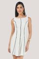 O tecido de toque seco e levemente texturizado remete ao linho, proporcionando conforto e um caimento natural. O design sem mangas valoriza a silhueta com recortes verticais destacados por vivos em cor contrastante. A modelagem com saia levemente evasê garante movimento e leveza ao visual, com fechamento em zíper nas costas. Ideal para ocasiões diurnas ou eventos casuais elegantes, mantendo uma proposta fresca e sofisticada.
