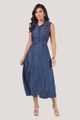 O denim de toque macio e encorpado envolve o corpo com leveza, oferecendo uma textura suave e confortável ao vestir. O design sem mangas traz abotoamento frontal, cinto ajustável e pespontos contrastantes que valorizam a silhueta. O bordado delicado na gola e no bolsinho adiciona um detalhe artesanal que enriquece o visual. Versátil para o dia a dia, combina com sandálias, tênis ou botas, adaptando-se facilmente a diferentes ocasiões.