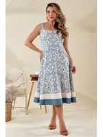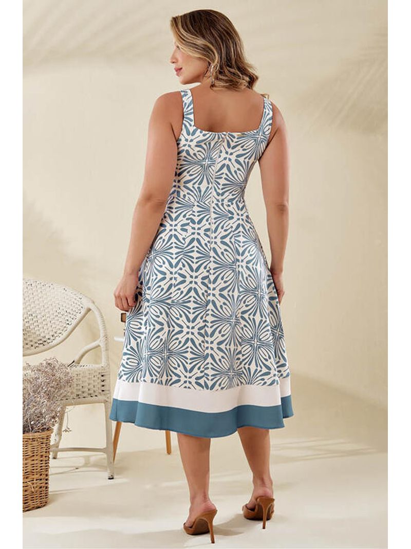 VESTIDO MIDI ESTAMPADO EM TECIDO ALFAIATARIA COM GRAMATURA MÉDIA, COM DECOTE QUADRADO, RECORTE NA CINTURA E NESGAS NA SAIA.