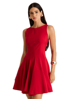VESTIDO CURTO EM TECIDO PLANO DE ALFAIATARIA LEVE, PEÇA CAVADA COMD ECOTE CANOA, FRENTE TODA TRABALHADA COM NESGAS E COM ZIPER COSTAS.