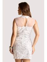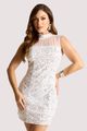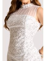 O vestido revela um tecido diferenciado, com bordados e paetês que criam um brilho sofisticado a cada movimento. A transparência do tule no colo e nas costas traz leveza, equilibrando a estrutura do corpo da peça. O decote alto bordado com aplicações em destaque adiciona ainda mais glamour. Perfeito para festas, coquetéis ou eventos noturnos, pode ser usado com sandálias delicadas e acessórios discretos para valorizar o efeito luxuoso do bordado.