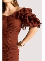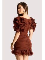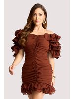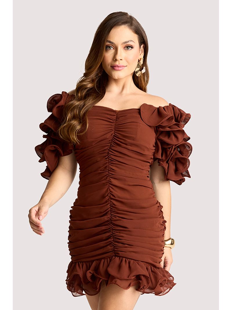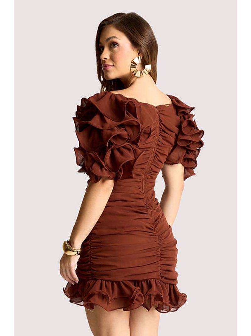 Vestido curto em amarelo vibrante, confeccionado em tecido fluido de toque macio. Possui franzido central que valoriza a silhueta e mangas bufantes com camadas volumosas em efeito pétala. A barra com babados acrescenta movimento e leveza. Perfeito para festas, coquetéis e ocasiões especiais, combinado a sandálias delicadas e clutch elegante.