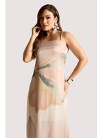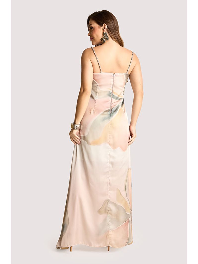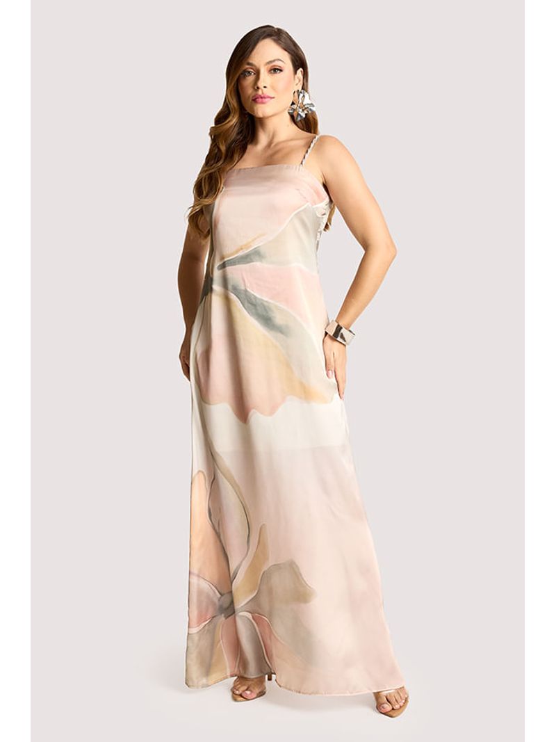 Este slip dress em tecido acetinado encanta pela delicadeza da estamparia aquarelada, que mistura tons suaves e contornos orgânicos em uma composição elegante. O tecido fluido realça o brilho sutil e o toque macio da superfície, trazendo sofisticação ao visual. De modelagem reta e alças finas trançadas de strass, oferece caimento leve e feminino. Possui pences estratégicas que valorizam a silhueta e zíper posterior, garantindo melhor ajuste e acabamento refinado.