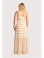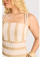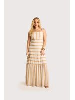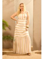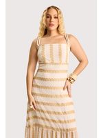 O tecido leve e fluido desliza com suavidade, revelando uma leve translucidez que cria um efeito etéreo ao lado dos bordados dourados. O design valoriza a silhueta com alças delicadas, linhas contínuas de bordado e caimento alongado que finaliza em uma barra com movimento. A peça transmite elegância descontraída sem esforço. Perfeita para eventos diurnos, harmoniza com sandálias delicadas e acessórios minimalistas.