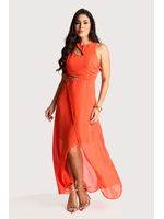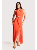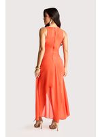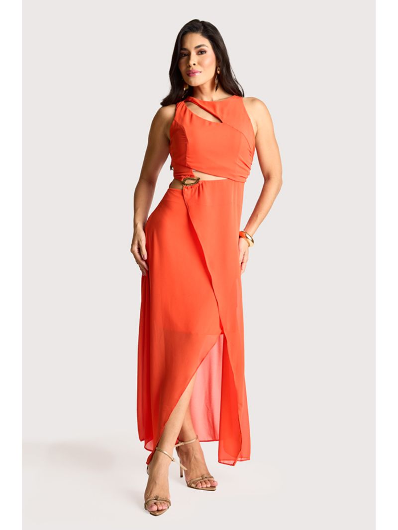 Com caimento fluido e leve transparência, o tecido traz sensação de movimento e suavidade ao vestir. O design com recortes assimétricos e fivela lateral valoriza a silhueta com um toque contemporâneo. O comprimento longo reforça a elegância da peça, perfeita para eventos ao entardecer ou produções sofisticadas com sandálias de salto fino.