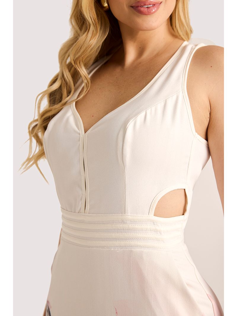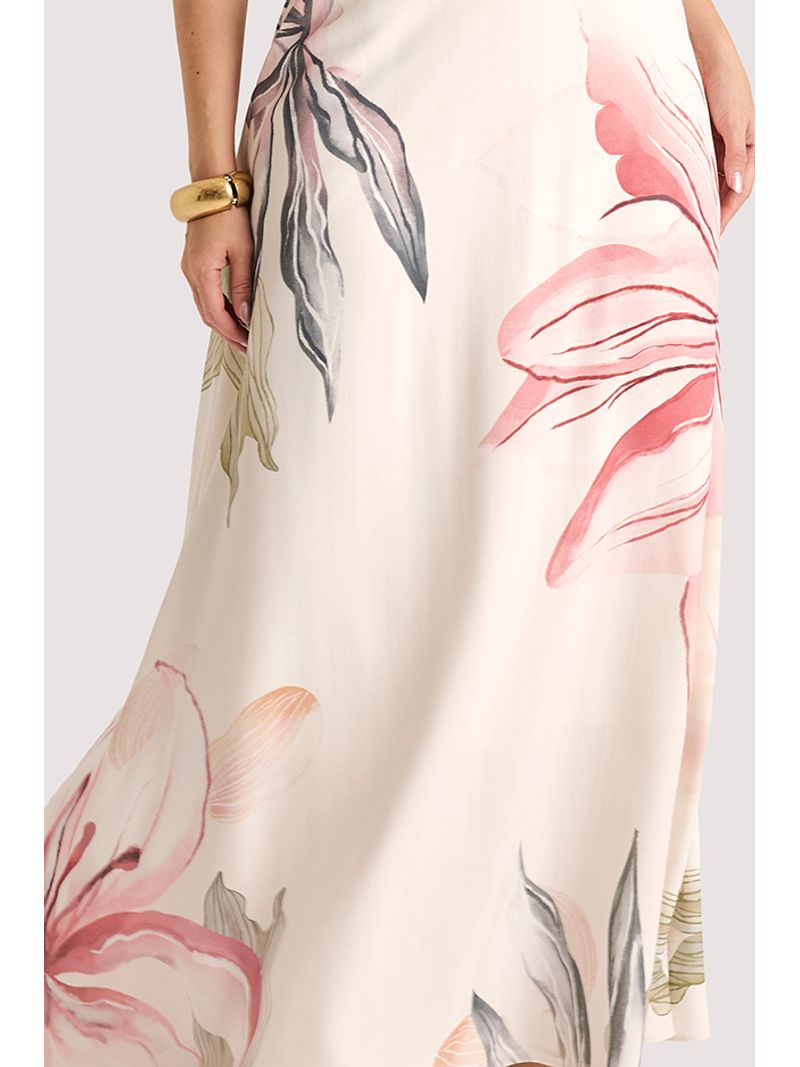 O vestido longo com viés contrastante une estrutura e fluidez em uma proposta sofisticada e versátil. Com decote em V e recorte na cintura, valoriza a silhueta de forma elegante, enquanto o tecido plano de toque suave e caimento leve garante movimento e conforto. A estampa floral em aquarela, delicada e artística, traz leveza e frescor. Nas costas, o zíper embutido assegura um fechamento prático e discreto, mantendo o acabamento impecável.