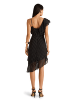 Vestido confeccionado em tecido leve e fluido, possui caimento delicado que valoriza as formas femininas com naturalidade. A estrutura traz decote em V, alça fina assimétrica, babados estratégicos e barra em camadas com transparência, criando movimento e leveza. Possui fechamento por zíper nas costas.