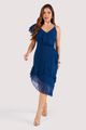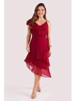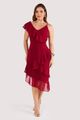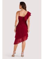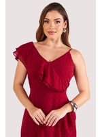 O vestido apresenta modelagem evasê com recorte assimétrico na barra, criando movimento fluido e delicado. O decote em ¿V¿ transpassado valoriza o colo, enquanto o babado duplo aplicado diagonalmente conduz o olhar de forma orgânica e acrescenta leveza à silhueta. O detalhe do ombro único com alça fina e babado de chiffon reforça a assimetria, equilibrando feminilidade e modernidade.