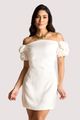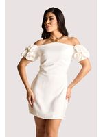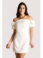 O tecido tem toque acetinado e brilho sutil, conferindo elegância e frescor ao vestir. O design curto e minimalista ganha destaque nas mangas bufantes adornadas por flores estruturadas, que evocam romantismo e arte. O lastex nas costas garante conforto e ajuste perfeito. Ideal para festas diurnas, combina bem com sandálias de tiras finas e acessórios dourados.