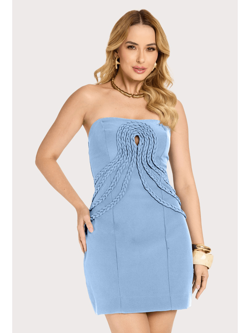 Vestido curto em tecido de alfaiataria, com modelagem justa.Peça sem alça, com decote apresentando vazado central e recortes modeladores que proporcionam ajuste perfeito. Conta com aplicações de tranças feitas do próprio tecido.Fechamento nas costas por zíper, garantindo praticidade e acabamento impecável.